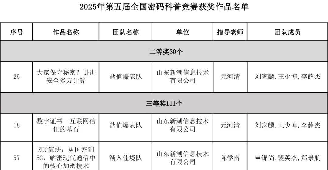 2025年8月14日,第五届全国密码科普竞赛决赛在河南新乡圆满落幕!本次竞赛由国家密码管理局指导,中国密码学会主办,中国密码学会教育与科普工作委员会、河南师范大学计算与信息工程学院承办。来自全国各地94个密码相关单位的347支团队报名参赛,提交参赛作品348件。经过形式审查与网络初评,158件参赛作品入围决赛。经过专家及大众网络评审,147件作品获奖,其中6个作品荣获一等奖,30个作品获得二等奖,111个作品获得三等奖。