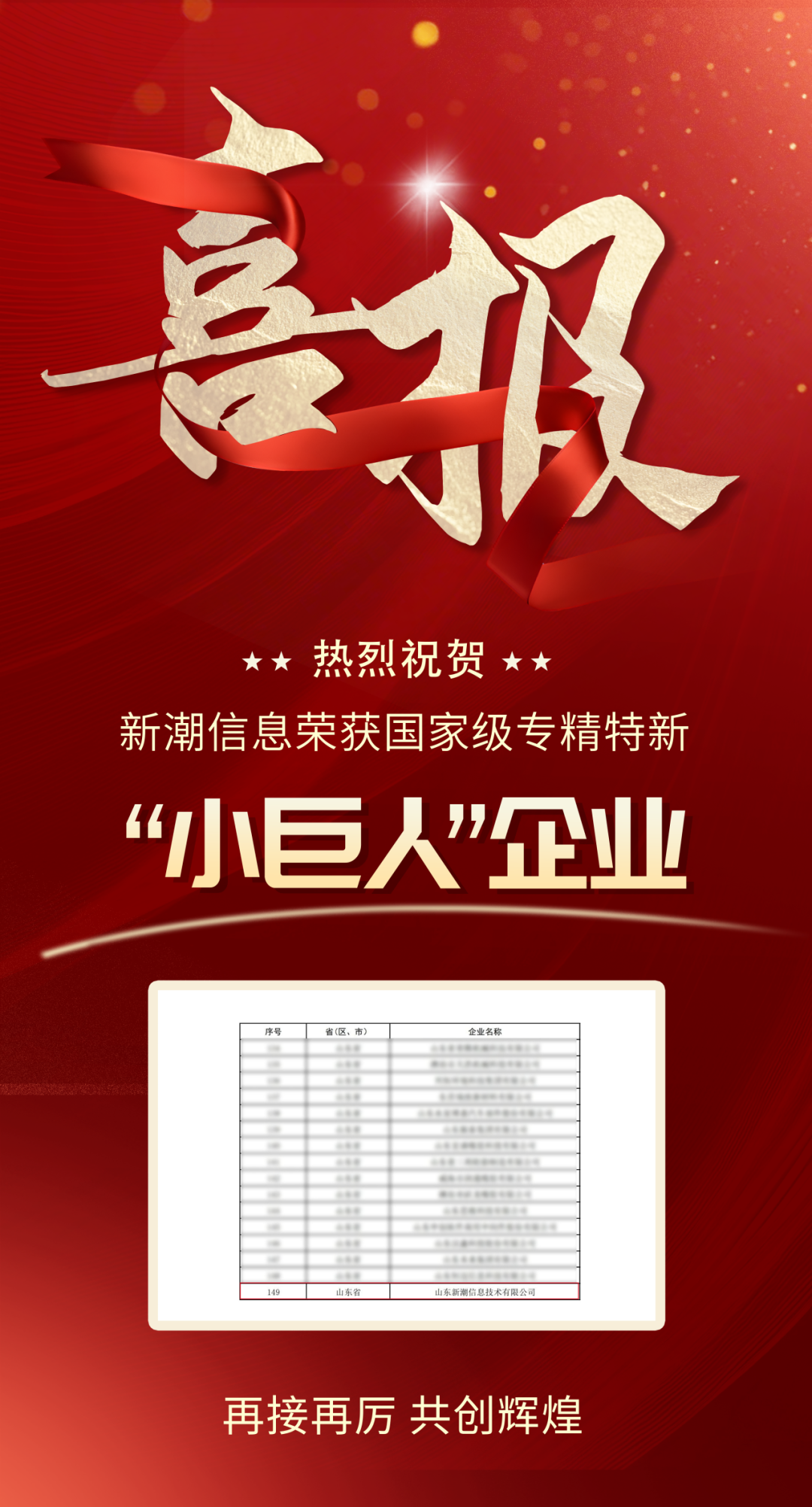 山东新潮信息技术有限公司(以下简称“新潮信息”)凭借深厚的技术积累与卓越的创新能力,成功入选国家工信部第七批专精特新“小巨人”企业名单!