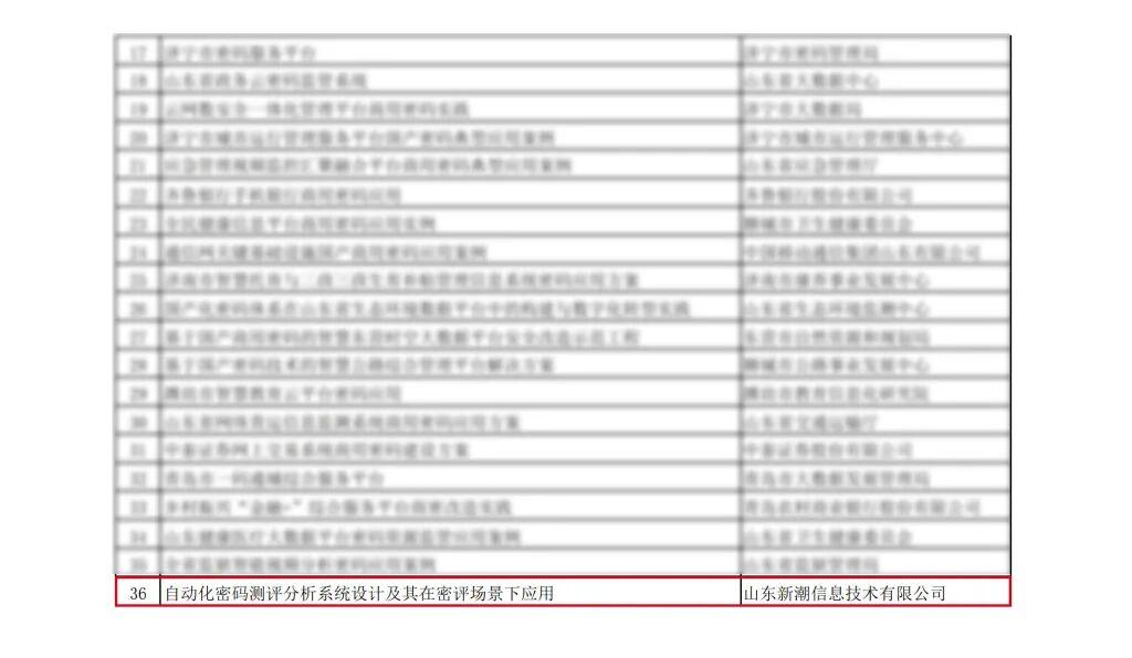近日,山东省密码管理局、山东省工业和信息化厅、山东省大数据局组织开展了2025年山东省商用密码典型应用方案评选结果公示活动。山东新潮信息技术有限公司组织申报的“自动化密码测评分析系统设计及其在密评场景下应用”获评典型创新应用案例。